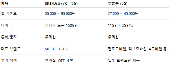 - 알뜰폰 5G 요금제 (월 2~3만 원대)